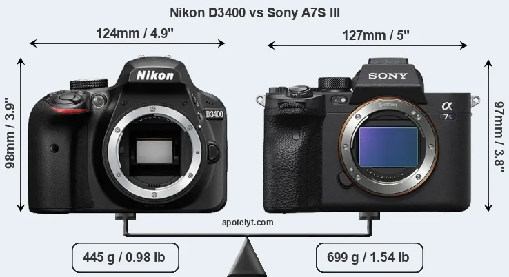 If the front view area (width x height) of the cameras is taken as an aggregate measure of their size, the Sony A7S III is somewhat larger (1 percent) than the Nikon D3400. Moreover, the A7S III is substantially heavier (57 percent) than the D3400. It is noteworthy in this context that the A7S III is splash and dust-proof, while the D3400 does not feature any corresponding weather-sealing.