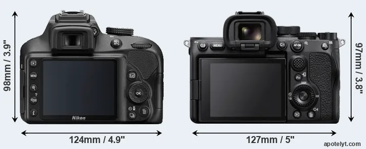 The physical size and weight of the Nikon D3400 and the Sony A7S III are illustrated in the side-by-side display below. The two cameras are presented according to their relative size. Three consecutive views from the front, the top, and the rear side are shown. All width, height and depth dimensions are rounded to the nearest millimeter.