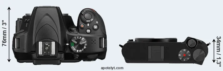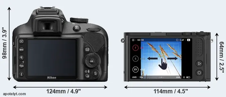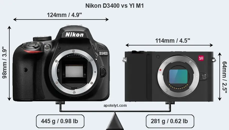 The physical size and weight of the Nikon D3400 and the YI M1 are illustrated in the side-by-side display below. The two cameras are presented according to their relative size. Three consecutive perspectives from the front, the top, and the back are available. All width, height and depth dimensions are rounded to the nearest millimeter.