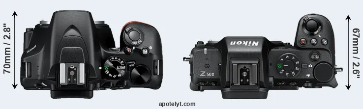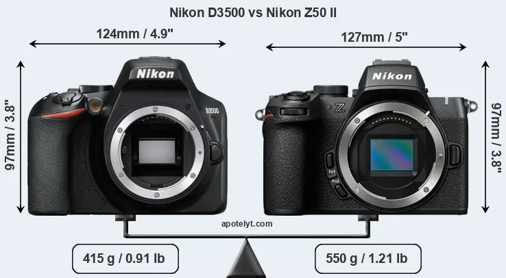 The side-by-side display below illustrates the physical size and weight of the Nikon D3500 and the Nikon Z50 II. The two cameras are presented according to their relative size. Three successive views from the front, the top, and the rear are shown. All width, height and depth dimensions are rounded to the nearest millimeter.