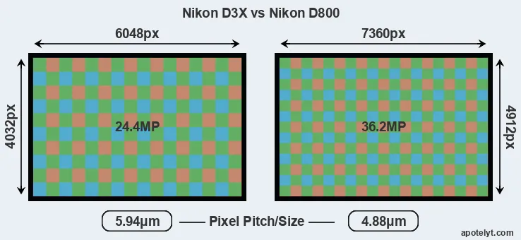 While the two cameras under review share the same sensor size, the D800 offers a higher resolution of 36.2 megapixels, compared with 24.4 MP of the D3X. This megapixels advantage translates into a 22 percent gain in linear resolution. On the other hand, these sensor specs imply that the D800 has a higher pixel density and a smaller size of the individual pixel (with a pixel pitch of 4.88μm versus 5.94μm for the D3X). However, it should be noted that the D800 is much more recent (by 3 years and 2 months) than the D3X, and its sensor will have benefitted from technological advances during this time that compensate for the smaller pixel size.