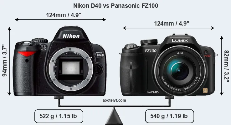 An illustration of the physical size and weight of the Nikon D40 and the Panasonic FZ100 is provided in the side-by-side display below. The two cameras are presented according to their relative size. Three consecutive perspectives from the front, the top, and the back are available. All size dimensions are rounded to the nearest millimeter.