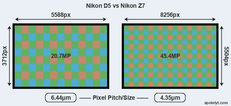 While the two cameras under review share the same sensor size, the Z7 offers a higher resolution of 45.4 megapixels, compared with 20.7 MP of the D5. This megapixels advantage translates into a 48 percent gain in linear resolution. On the other hand, these sensor specs imply that the Z7 has a higher pixel density and a smaller size of the individual pixel (with a pixel pitch of 4.35μm versus 6.44μm for the D5). However, it should be noted that the Z7 is much more recent (by 2 years and 7 months) than the D5, and its sensor will have benefitted from technological advances during this time that compensate for the smaller pixel size. Coming back to sensor resolution, it should be mentioned that the Z7 has no anti-alias filter installed, so that it can capture all the detail its sensor resolves.