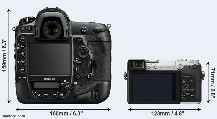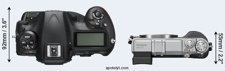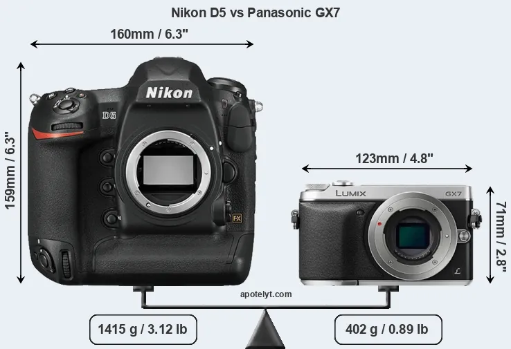 The physical size and weight of the Nikon D5 and the Panasonic GX7 are illustrated in the side-by-side display below. The two cameras are presented according to their relative size. Three consecutive perspectives from the front, the top, and the back are available. All width, height and depth measures are rounded to the nearest millimeter.