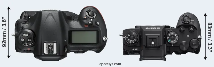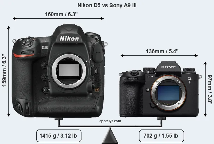 The side-by-side display below illustrates the physical size and weight of the Nikon D5 and the Sony A9 III. The two cameras are presented according to their relative size. Three consecutive views from the front, the top, and the rear side are shown. All width, height and depth measures are rounded to the nearest millimeter.