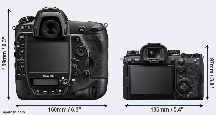 The above size and weight comparisons are to some extent incomplete since they do not consider the interchangeable lenses that both of these cameras require. Both cameras have similarly sized sensors, but DSLRs have a larger flange-to-focal plane distance than mirrorless cameras, which imposes contraints on the optical engineering process and generally leads to bigger and heavier lenses. You can compare the optics available for the two cameras in the Nikon Lens Catalog (D5) and the Sony FE Lens Catalog (A9 III). Mirrorless cameras, such as the A9 III, have moreover the advantage that they can use many lenses from other systems via adapters, as they have a relatively short flange to focal plane distance.