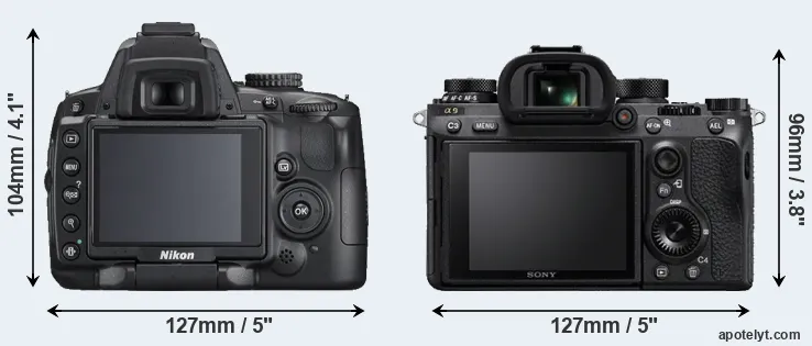 The physical size and weight of the Nikon D5000 and the Sony A9 are illustrated in the side-by-side display below. The two cameras are presented according to their relative size. Three successive views from the front, the top, and the rear are shown. All size dimensions are rounded to the nearest millimeter.