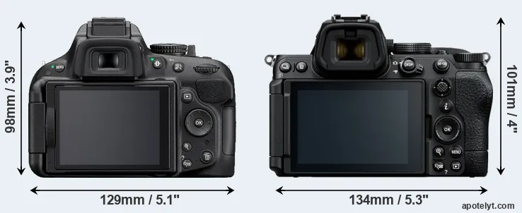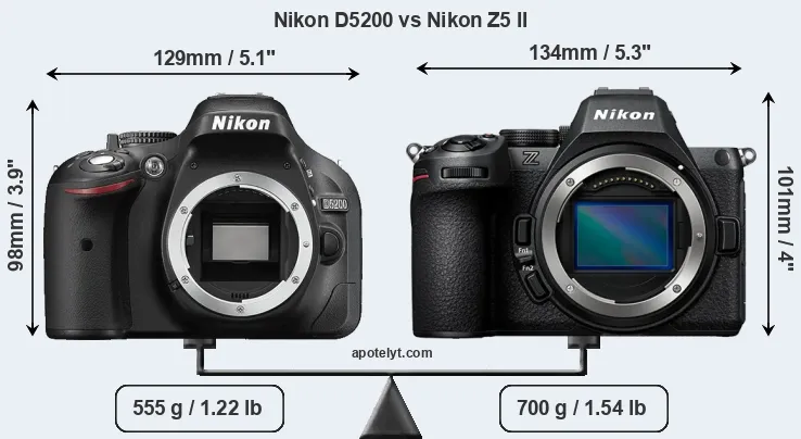 An illustration of the physical size and weight of the Nikon D5200 and the Nikon Z5 II is provided in the side-by-side display below. The two cameras are presented according to their relative size. Three consecutive perspectives from the front, the top, and the back are available. All width, height and depth dimensions are rounded to the nearest millimeter.