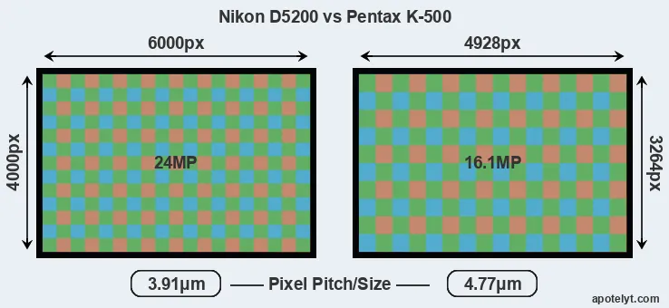 While the two cameras under review share the same sensor size, the D5200 offers a higher resolution of 24 megapixels, compared with 16.1 MP of the K-500. This megapixels advantage translates into a 22 percent gain in linear resolution. On the other hand, these sensor specs imply that the D5200 has a higher pixel density and a smaller size of the individual pixel (with a pixel pitch of 3.91μm versus 4.77μm for the K-500). Moreover, it should be noted that the K-500 is a somewhat more recent model (by 7 months) than the D5200, and its sensor might have benefitted from technological advances during this time that further enhance the light gathering capacity of individual pixels.
