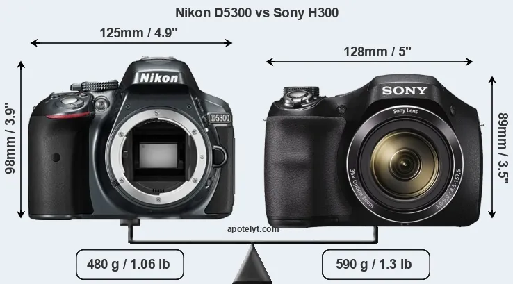 The physical size and weight of the Nikon D5300 and the Sony H300 are illustrated in the side-by-side display below. The two cameras are presented according to their relative size. Three successive views from the front, the top, and the rear are shown. All width, height and depth measures are rounded to the nearest millimeter.