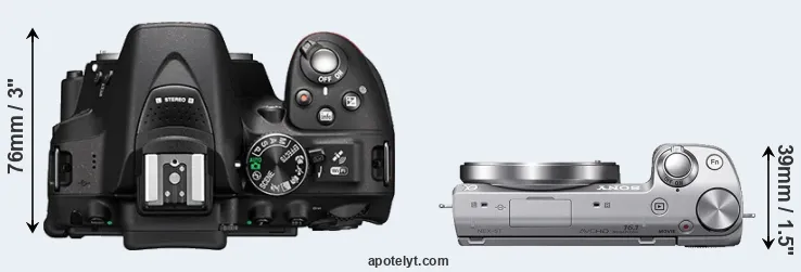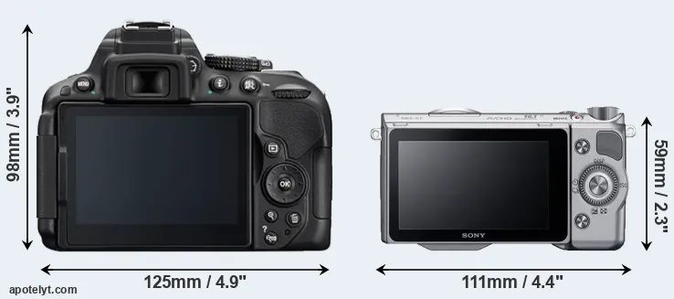 The side-by-side display below illustrates the physical size and weight of the Nikon D5300 and the Sony NEX-5T. The two cameras are presented according to their relative size. Three successive views from the front, the top, and the rear are shown. All width, height and depth measures are rounded to the nearest millimeter.