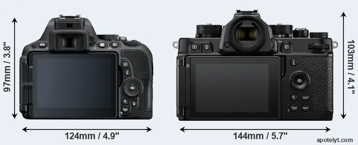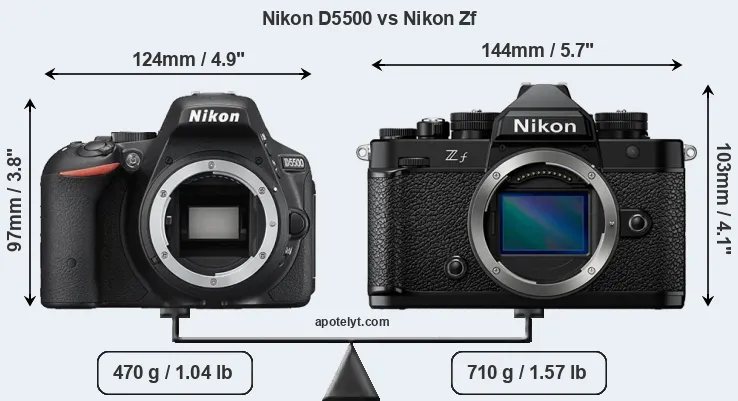 If the front view area (width x height) of the cameras is taken as an aggregate measure of their size, the Nikon Zf is notably larger (23 percent) than the Nikon D5500. Moreover, the Zf is substantially heavier (51 percent) than the D5500. It is noteworthy in this context that the Zf is splash and dust-proof, while the D5500 does not feature any corresponding weather-sealing.