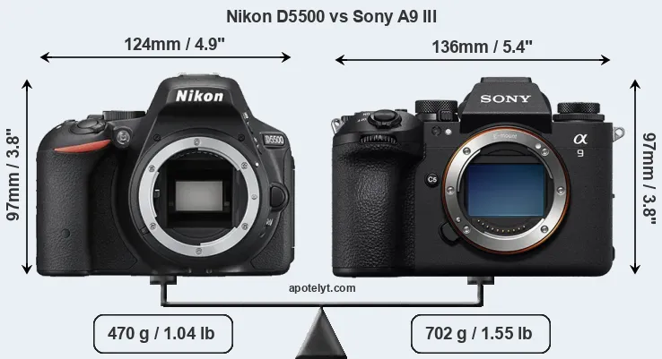 If the front view area (width x height) of the cameras is taken as an aggregate measure of their size, the Sony A9 III is notably larger (10 percent) than the Nikon D5500. Moreover, the A9 III is substantially heavier (49 percent) than the D5500. It is noteworthy in this context that the A9 III is splash and dust-proof, while the D5500 does not feature any corresponding weather-sealing.