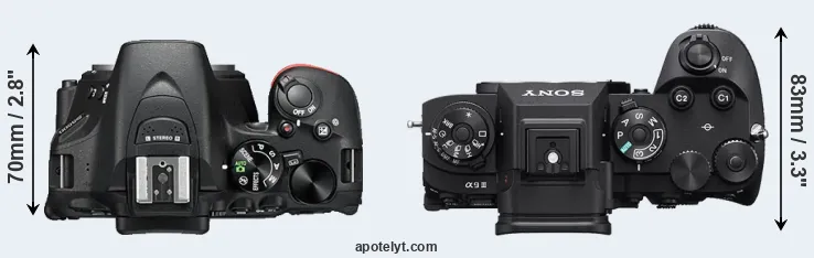 The physical size and weight of the Nikon D5500 and the Sony A9 III are illustrated in the side-by-side display below. The two cameras are presented according to their relative size. Three consecutive views from the front, the top, and the rear side are shown. All size dimensions are rounded to the nearest millimeter.