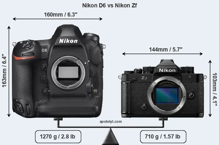 An illustration of the physical size and weight of the Nikon D6 and the Nikon Zf is provided in the side-by-side display below. The two cameras are presented according to their relative size. Three consecutive perspectives from the front, the top, and the back are available. All width, height and depth measures are rounded to the nearest millimeter.