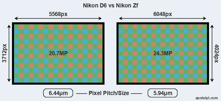 While the two cameras under review share the same sensor size, the Zf offers a higher resolution of 24.3 megapixels, compared with 20.7 MP of the D6. This megapixels advantage translates into a 9 percent gain in linear resolution. On the other hand, these sensor specs imply that the Zf has a higher pixel density and a smaller size of the individual pixel (with a pixel pitch of 5.94μm versus 6.44μm for the D6). However, it should be noted that the Zf is much more recent (by 3 years and 7 months) than the D6, and its sensor will have benefitted from technological advances during this time that compensate for the smaller pixel size.