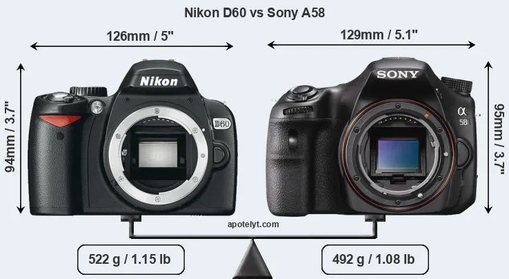 An illustration of the physical size and weight of the Nikon D60 and the Sony A58 is provided in the side-by-side display below. The two cameras are presented according to their relative size. Three consecutive perspectives from the front, the top, and the back are available. All size dimensions are rounded to the nearest millimeter.