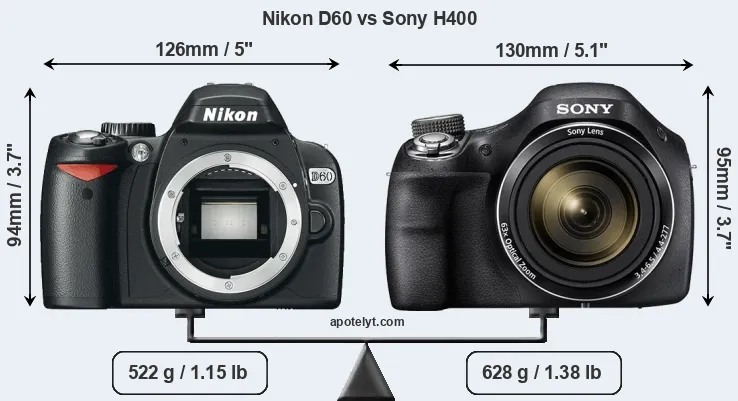 The side-by-side display below illustrates the physical size and weight of the Nikon D60 and the Sony H400. The two cameras are presented according to their relative size. Three consecutive views from the front, the top, and the rear side are shown. All width, height and depth dimensions are rounded to the nearest millimeter.