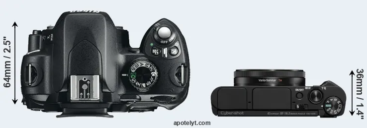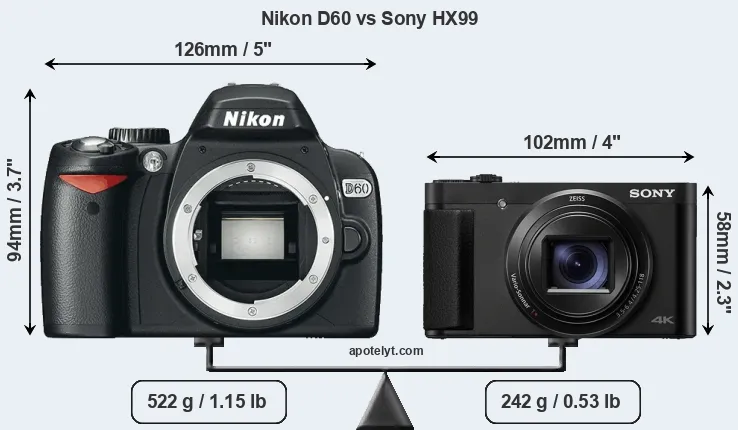 The physical size and weight of the Nikon D60 and the Sony HX99 are illustrated in the side-by-side display below. The two cameras are presented according to their relative size. Three consecutive perspectives from the front, the top, and the back are available. All width, height and depth dimensions are rounded to the nearest millimeter.