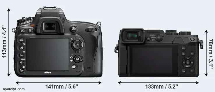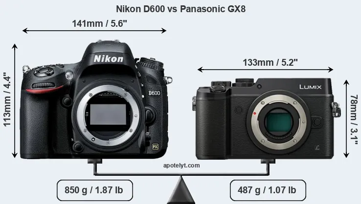 The physical size and weight of the Nikon D600 and the Panasonic GX8 are illustrated in the side-by-side display below. The two cameras are presented according to their relative size. Three consecutive views from the front, the top, and the rear side are shown. All width, height and depth measures are rounded to the nearest millimeter.