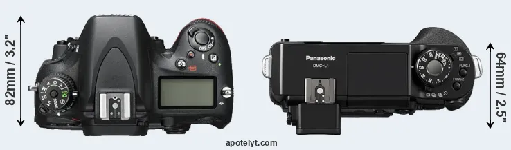 The physical size and weight of the Nikon D600 and the Panasonic L1 are illustrated in the side-by-side display below. The two cameras are presented according to their relative size. Three successive views from the front, the top, and the rear are shown. All width, height and depth dimensions are rounded to the nearest millimeter.