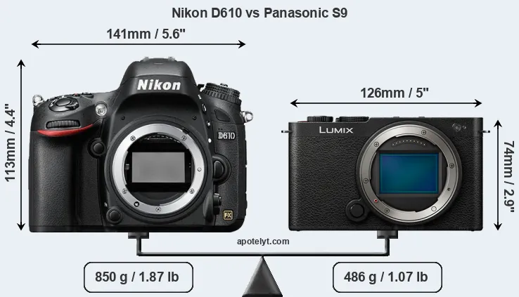 An illustration of the physical size and weight of the Nikon D610 and the Panasonic S9 is provided in the side-by-side display below. The two cameras are presented according to their relative size. Three successive views from the front, the top, and the rear are shown. All width, height and depth dimensions are rounded to the nearest millimeter.