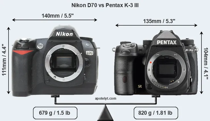 If the front view area (width x height) of the cameras is taken as an aggregate measure of their size, the Pentax K-3 III is notably smaller (10 percent) than the Nikon D70. However, the K-3 III is markedly heavier (21 percent) than the D70. It is noteworthy in this context that the K-3 III is splash and dust-proof, while the D70 does not feature any corresponding weather-sealing.