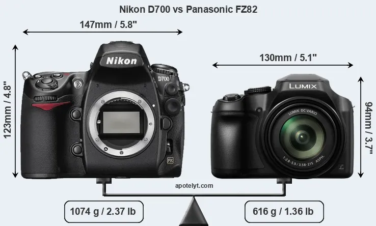 An illustration of the physical size and weight of the Nikon D700 and the Panasonic FZ82 is provided in the side-by-side display below. The two cameras are presented according to their relative size. Three consecutive perspectives from the front, the top, and the back are available. All size dimensions are rounded to the nearest millimeter.