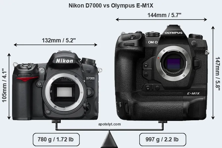 The physical size and weight of the Nikon D7000 and the Olympus E-M1X are illustrated in the side-by-side display below. The two cameras are presented according to their relative size. Three consecutive perspectives from the front, the top, and the back are available. All width, height and depth measures are rounded to the nearest millimeter.