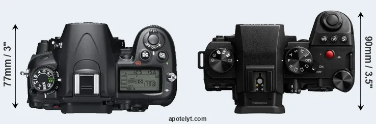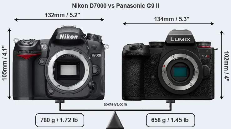 The side-by-side display below illustrates the physical size and weight of the Nikon D7000 and the Panasonic G9 II. The two cameras are presented according to their relative size. Three consecutive perspectives from the front, the top, and the back are available. All width, height and depth measures are rounded to the nearest millimeter.
