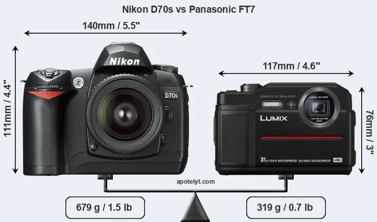 The side-by-side display below illustrates the physical size and weight of the Nikon D70s and the Panasonic FT7. The two cameras are presented according to their relative size. Three consecutive perspectives from the front, the top, and the back are available. All size dimensions are rounded to the nearest millimeter.