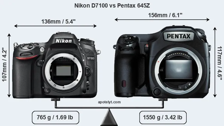 The side-by-side display below illustrates the physical size and weight of the Nikon D7100 and the Pentax 645Z. The two cameras are presented according to their relative size. Three successive views from the front, the top, and the rear are shown. All width, height and depth dimensions are rounded to the nearest millimeter.
