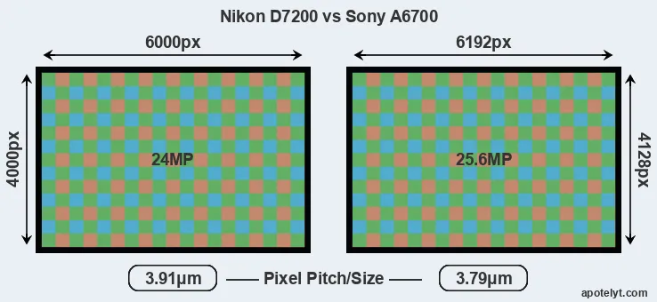While the two cameras under review share the same sensor size, the A6700 offers a slightly higher resolution of 25.6 megapixels, compared with 24 MP of the D7200. This megapixels advantage translates into a 3 percent gain in linear resolution. On the other hand, these sensor specs imply that the A6700 has a higher pixel density and a smaller size of the individual pixel (with a pixel pitch of 3.79μm versus 3.91μm for the D7200). However, it should be noted that the A6700 is much more recent (by 8 years and 4 months) than the D7200, and its sensor will have benefitted from technological advances during this time that compensate for the smaller pixel size. Coming back to sensor resolution, it should be mentioned that the D7200 has no anti-alias filter installed, so that it can capture all the detail its sensor resolves.