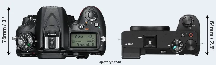 An illustration of the physical size and weight of the Nikon D7200 and the Sony A6700 is provided in the side-by-side display below. The two cameras are presented according to their relative size. Three consecutive perspectives from the front, the top, and the back are available. All size dimensions are rounded to the nearest millimeter.