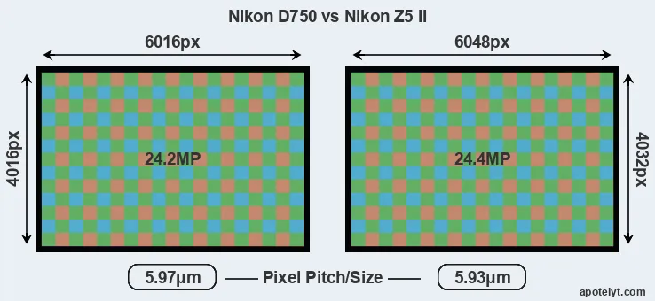 Despite having a slightly smaller sensor, the Z5 II offers a slightly higher resolution of 24.4 megapixels, compared with 24.2 MP of the D750. This megapixels advantage comes at the cost of a higher pixel density and a smaller size of the individual pixel (with a pixel pitch of 5.93μm versus 5.97μm for the D750). However, it should be noted that the Z5 II is much more recent (by 10 years and 6 months) than the D750, and its sensor will have benefitted from technological advances during this time that make it possible to gather light more efficiently.
