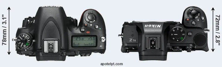 The physical size and weight of the Nikon D750 and the Nikon Z5 II are illustrated in the side-by-side display below. The two cameras are presented according to their relative size. Three consecutive views from the front, the top, and the rear side are shown. All size dimensions are rounded to the nearest millimeter.