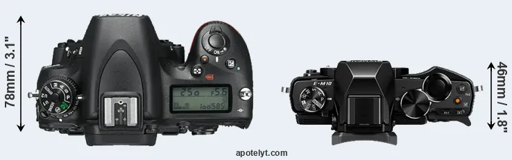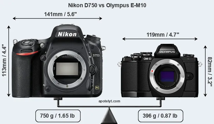 The side-by-side display below illustrates the physical size and weight of the Nikon D750 and the Olympus E-M10. The two cameras are presented according to their relative size. Three consecutive views from the front, the top, and the rear side are shown. All width, height and depth measures are rounded to the nearest millimeter.