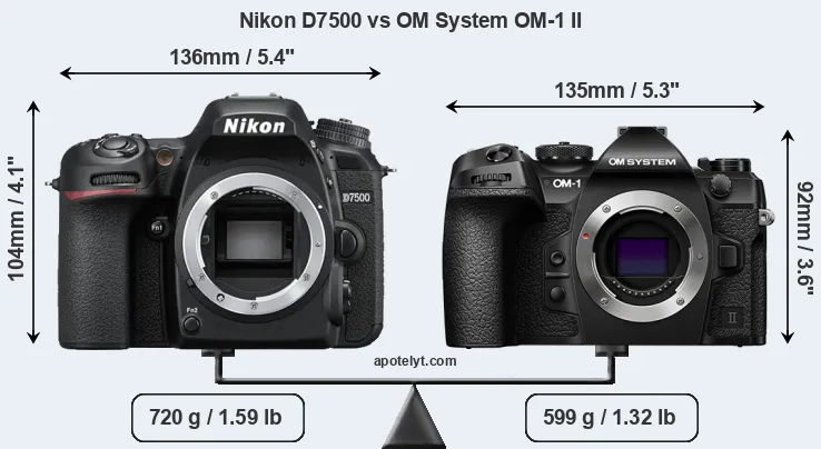 An illustration of the physical size and weight of the Nikon D7500 and the OM System OM-1 II is provided in the side-by-side display below. The two cameras are presented according to their relative size. Three consecutive perspectives from the front, the top, and the back are available. All size dimensions are rounded to the nearest millimeter.
