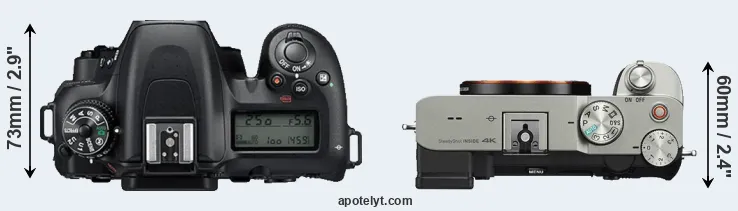 The physical size and weight of the Nikon D7500 and the Sony A7C are illustrated in the side-by-side display below. The two cameras are presented according to their relative size. Three consecutive views from the front, the top, and the rear side are shown. All width, height and depth dimensions are rounded to the nearest millimeter.