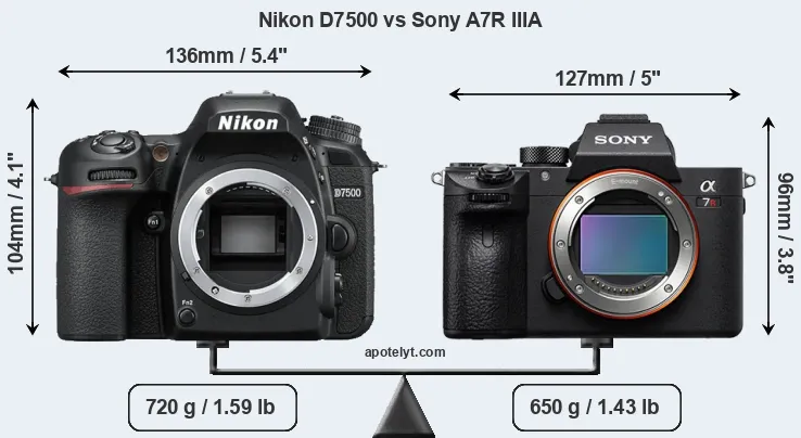 An illustration of the physical size and weight of the Nikon D7500 and the Sony A7R IIIA is provided in the side-by-side display below. The two cameras are presented according to their relative size. Three successive views from the front, the top, and the rear are shown. All size dimensions are rounded to the nearest millimeter.