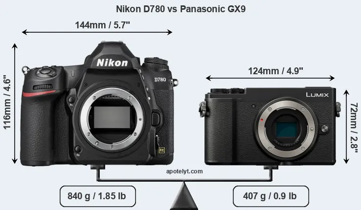 An illustration of the physical size and weight of the Nikon D780 and the Panasonic GX9 is provided in the side-by-side display below. The two cameras are presented according to their relative size. Three consecutive perspectives from the front, the top, and the back are available. All size dimensions are rounded to the nearest millimeter.
