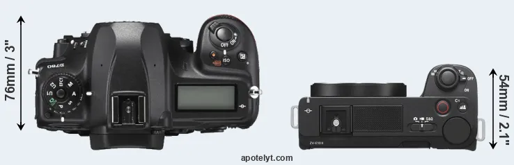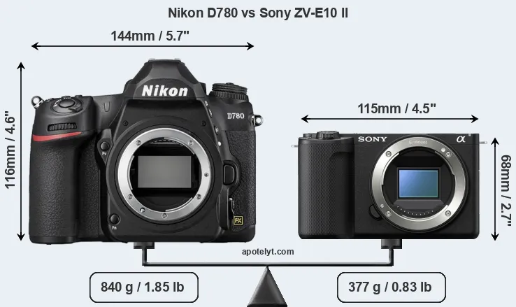 The physical size and weight of the Nikon D780 and the Sony ZV-E10 II are illustrated in the side-by-side display below. The two cameras are presented according to their relative size. Three successive views from the front, the top, and the rear are shown. All width, height and depth measures are rounded to the nearest millimeter.