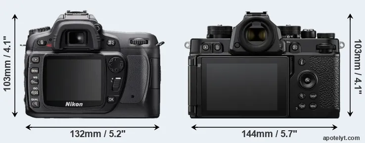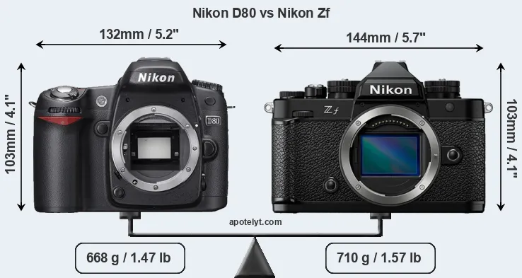 The physical size and weight of the Nikon D80 and the Nikon Zf are illustrated in the side-by-side display below. The two cameras are presented according to their relative size. Three successive views from the front, the top, and the rear are shown. All width, height and depth dimensions are rounded to the nearest millimeter.