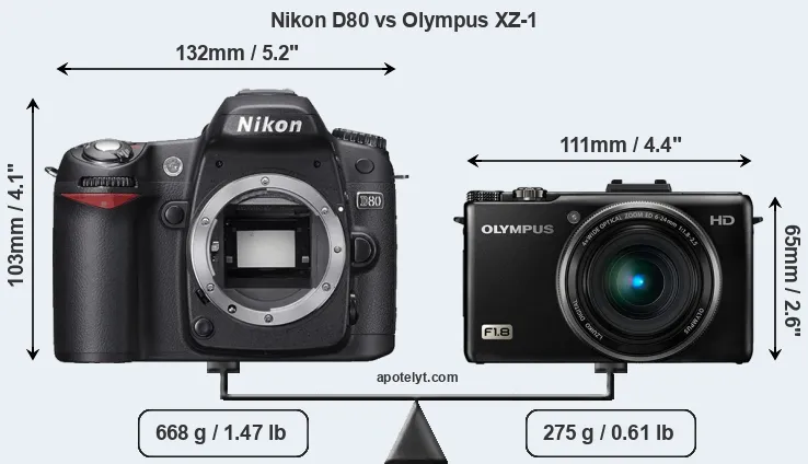 The side-by-side display below illustrates the physical size and weight of the Nikon D80 and the Olympus XZ-1. The two cameras are presented according to their relative size. Three successive views from the front, the top, and the rear are shown. All width, height and depth measures are rounded to the nearest millimeter.