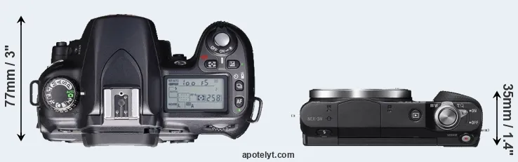 The side-by-side display below illustrates the physical size and weight of the Nikon D80 and the Sony NEX-3N. The two cameras are presented according to their relative size. Three consecutive views from the front, the top, and the rear side are shown. All width, height and depth dimensions are rounded to the nearest millimeter.