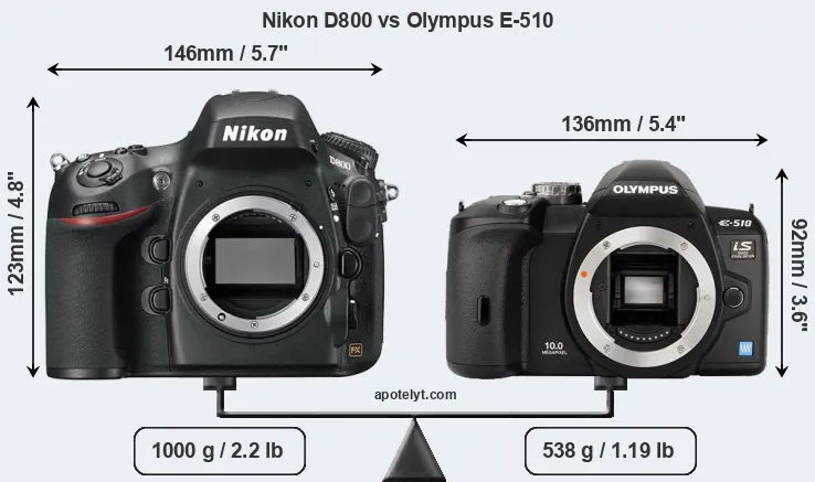 The physical size and weight of the Nikon D800 and the Olympus E-510 are illustrated in the side-by-side display below. The two cameras are presented according to their relative size. Three successive views from the front, the top, and the rear are shown. All width, height and depth dimensions are rounded to the nearest millimeter.