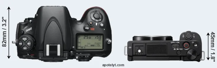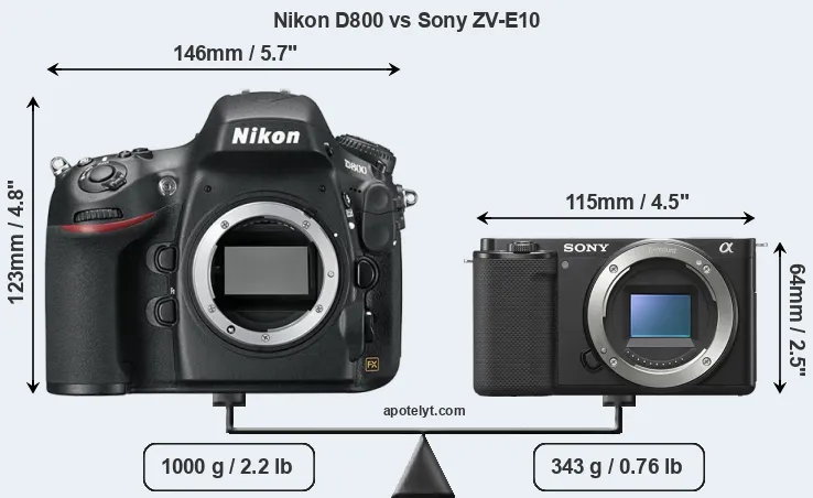 An illustration of the physical size and weight of the Nikon D800 and the Sony ZV-E10 is provided in the side-by-side display below. The two cameras are presented according to their relative size. Three consecutive perspectives from the front, the top, and the back are available. All size dimensions are rounded to the nearest millimeter.