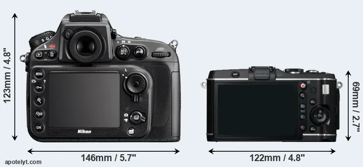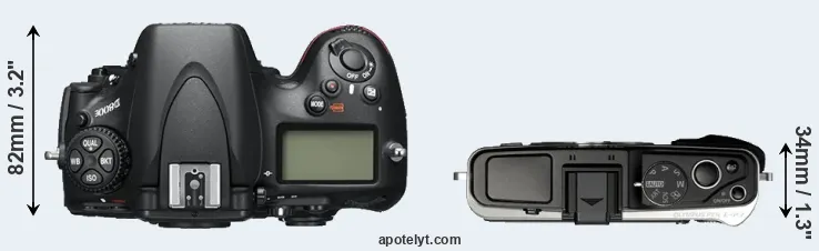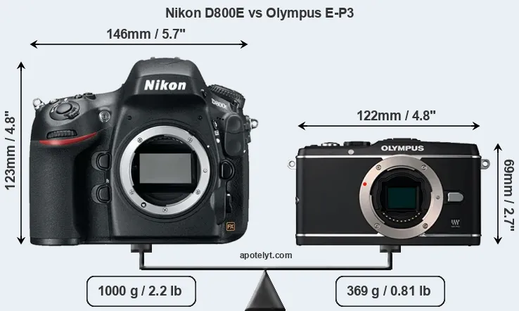 The physical size and weight of the Nikon D800E and the Olympus E-P3 are illustrated in the side-by-side display below. The two cameras are presented according to their relative size. Three consecutive perspectives from the front, the top, and the back are available. All width, height and depth dimensions are rounded to the nearest millimeter.
