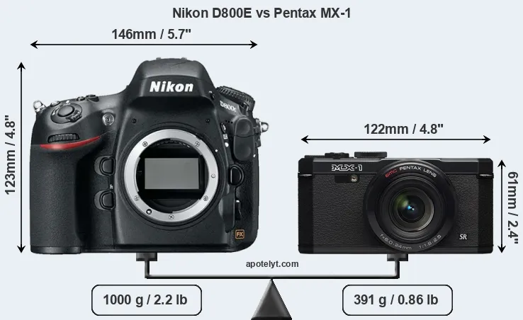 The side-by-side display below illustrates the physical size and weight of the Nikon D800E and the Pentax MX-1. The two cameras are presented according to their relative size. Three consecutive perspectives from the front, the top, and the back are available. All size dimensions are rounded to the nearest millimeter.