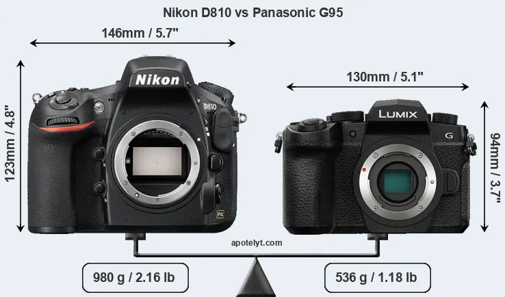 The physical size and weight of the Nikon D810 and the Panasonic G95 are illustrated in the side-by-side display below. The two cameras are presented according to their relative size. Three successive views from the front, the top, and the rear are shown. All width, height and depth dimensions are rounded to the nearest millimeter.